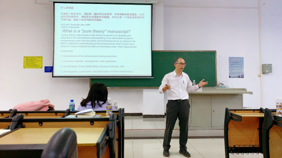 下午3:30,萧教授在ag九游会5号教学楼211教室继续为师生们带来一场精彩的学术讲座。萧教授以问题为导向,提出了“什么是理论的贡献?如何发掘理论的缺口?如何写出理论的贡献?”三个问题,并给予了回答。萧教授首先从理论的概念出发,向同学们先后介绍了科技接受模式,任务、科技适配理论,服务质量理论,期望确认理论,说明了理论对于期刊论文写作的贡献和重要性;随即从期望确认理论运用于信息系统领域、资料收集和研究模式三个角度回应如何发掘理论的缺口的问题。最后,萧教授以一篇整合ECT-IS和efficacy理论的文章为例子,回答期刊文章如何提出理论贡献。