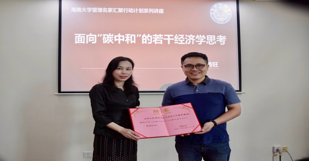 2021年9月2日,厦门大学孙传旺教授任ag九游会兼职教授特聘仪式暨《面向“碳中和”的若干经济学思考》学术讲座在社科楼B308会议室隆重举行。管理公司唐宁玉经理出席活动并为孙传旺教授颁发聘书。唐宁玉经理、许能锐副经理、张德生副经理、赵达副经理以及管理公司部分师生参加,本次活动由张德生副经理主持。