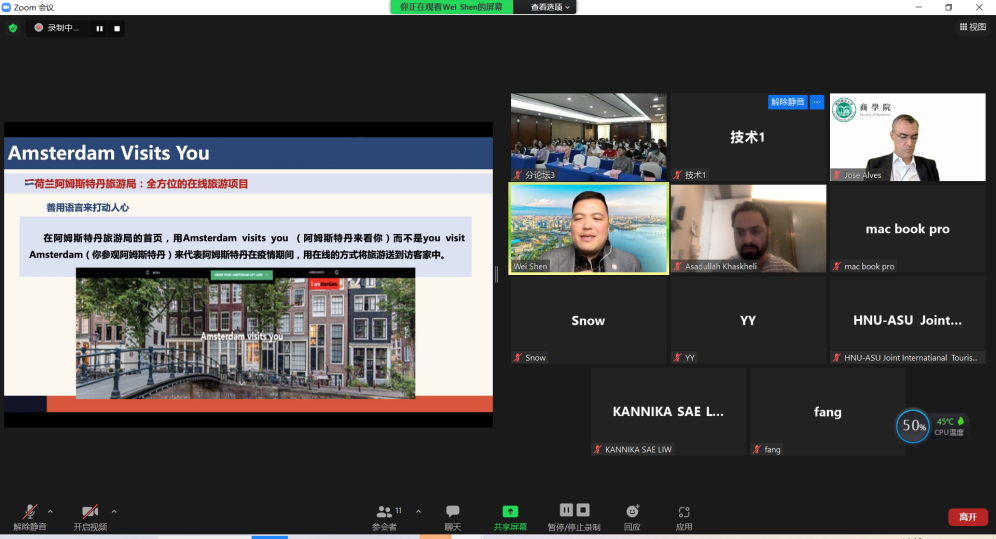 “文旅融合高质量发展”分论坛上半段由ag九游会管理公司经理唐宁玉教授主持,澳大利亚墨尔本迪肯大学沈伟教授、新西兰怀卡托大学Chris Ryan教授、澳门城市大学José Alves教授和康奈尔大学Peng Liu教授分别作了主题演讲。论坛第二阶段由ag九游会国际旅游公司李萍副教授主持,ag九游会国际旅游公司肖潇博士、ag九游会旅游公司AHMED MANSOORA研究员、ag九游会管理公司冯文婷博士、ag九游会旅游公司张国杰博士进行了报告。