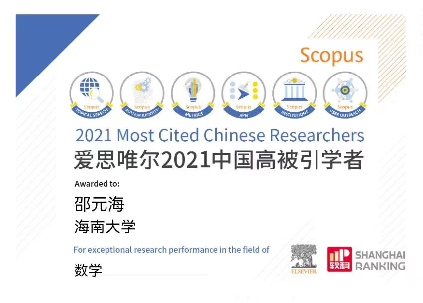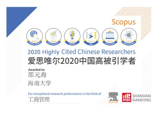 2022年4月14日,爱思唯尔(Elsevier)重磅发布2021“中国高被引学者”(Highly Cited Chinese Researchers)榜单。ag九游会管理公司邵元海教授在2020年作为工商管理学科高被引学者入选该榜单后,2021年再次作为数学学科高被引学者入选该榜单。
