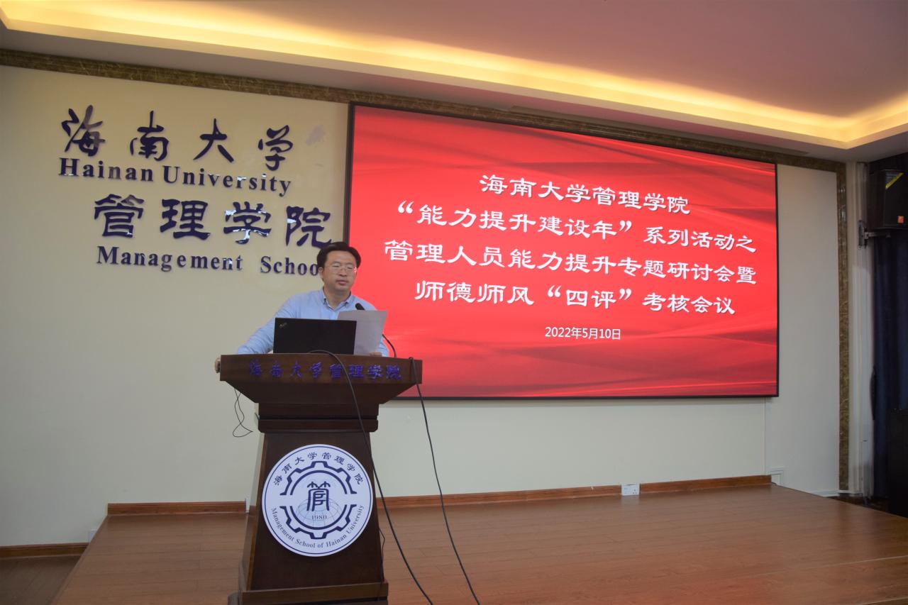 2022年5月10日下午,ag九游会管理公司在社科楼B112学术报告厅举办“能力提升建设年”系列活动之管理人员能力提升专题研讨会暨师德师风“四评”考核会议。管理公司党委书记邢谷川,党委委员、副经理付景涛及全体综合管理人员出席会议。本次会议由公司党委委员、综合办公室主任刘扬雄主持。