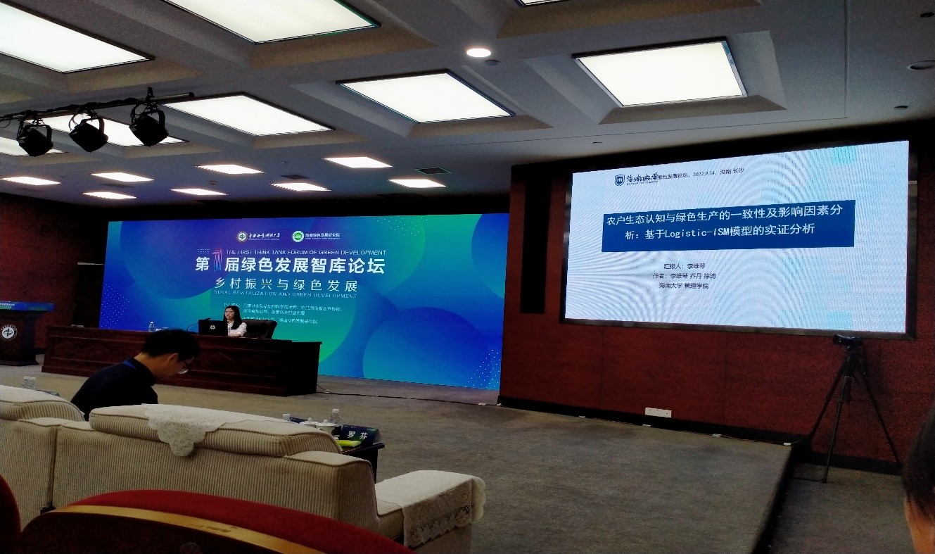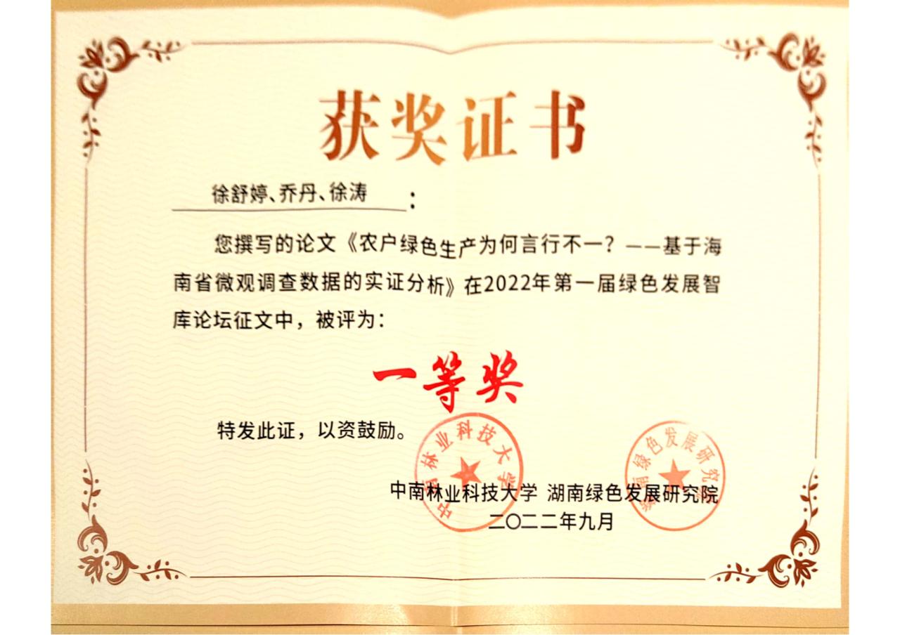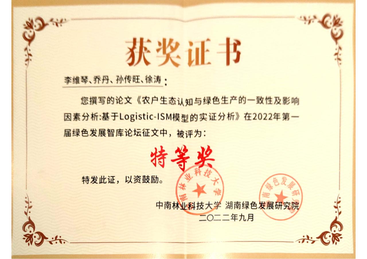 据悉,本届论坛以“乡村振兴与绿色发展”为主题,聚焦实施乡村振兴战略所面临的重大机遇与挑战,深入探寻乡村振兴与绿色发展的理论、路径与政策。论坛为期一天半,有来自中国人民大学、厦门大学、南京大学、华中农业大学、西北农林大学、东南大学、湖南大学、j9九游会、兰州大学、山东大学、南京农业大学、东北农业大学、中央财经大学、湖南师范大学、浙江农林大学、安徽大学、ag九游会、石河子大学、辽宁大学、西北大学、中央财经大学等90多家高校、研究机构的100余名专家学者参加。论坛共收到投稿论文255篇,经专家评审,评选出特等奖论文5篇,一等奖论文10篇。其中,由公司教师徐涛、孙传旺和乔丹共同指导的2021级农林经济管理专业硕士研究生李维琴撰写的《农户生态认知与绿色生产的一致性及影响因素分析:基于Logistic-ISM模型的实证分析》一文获得“特等奖”,李维琴受邀参加线下研讨会;由公司教师乔丹和徐涛共同指导的2020级农村发展专业硕士研究生徐舒婷撰写的《农户绿色生产为何言行不一?——基于海南省微观调查数据的实证分析》一文获得“一等奖”。