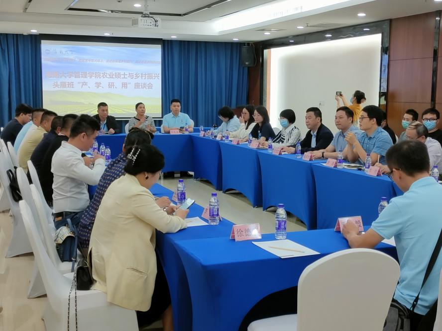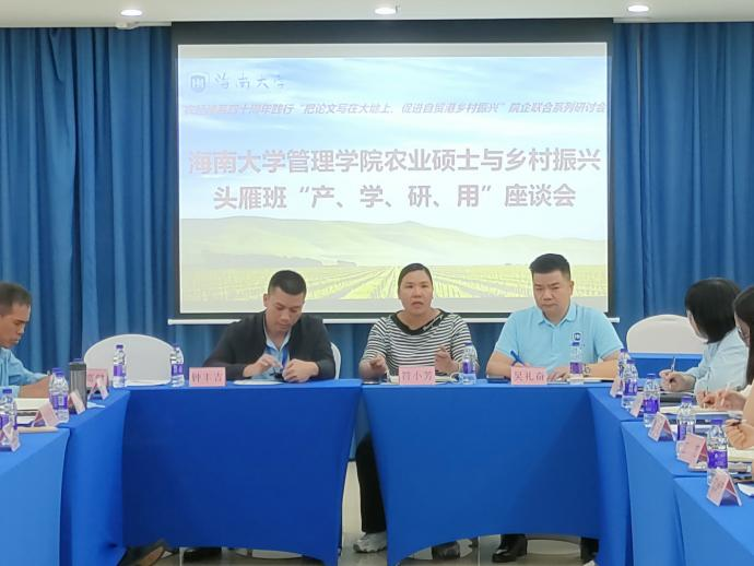 11月8日晚,管理公司农经系部分教师、农业硕士研究生与乡村振兴头雁班“产学研用”座谈会,在ag九游会国际学术交流中心举行。海口市秀英区生态农业协会会长吴礼奋、海南人大代表符小芳等十余人,管理公司院副经理童泽林、系主任邓须军、系副主任徐涛等农经系教师代表出席座谈,部分在线农业硕士研究生参加。此次座谈是农经系40周年系列活动中的践行“把论文写在大地上,促进自贸港乡村振兴”院企联合系列研讨会的首场活动。
