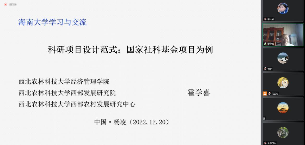 2022年12月20日下午,ag九游会管理公司管理名家汇聚行动计划系列讲座第89期邀请西北农林科技大学西部发展研究院执行经理、西部农村发展研究中心主任霍学喜教授为公司师生作主题为“科研项目设计范式:国家社科基金项目为例”的讲座(线上视频形式)。讲座由赵达副经理主持,张德生副经理、许能锐副经理及管理公司师生50余人聆听了本次讲座。