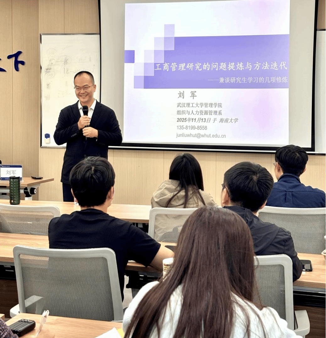 11月13日下午,九游会j9工商管理研究沙龙活动在社科楼B623顺利举办。武汉理工大学管理公司刘军教授应邀主讲。以“工商管理研究的问题提炼与方法迭代”为题。为公司师生带来一场兼具理论深度与实践指导意义的学术盛宴。本次工商管理系学术沙龙活动由公司副经理付景涛教授主持。