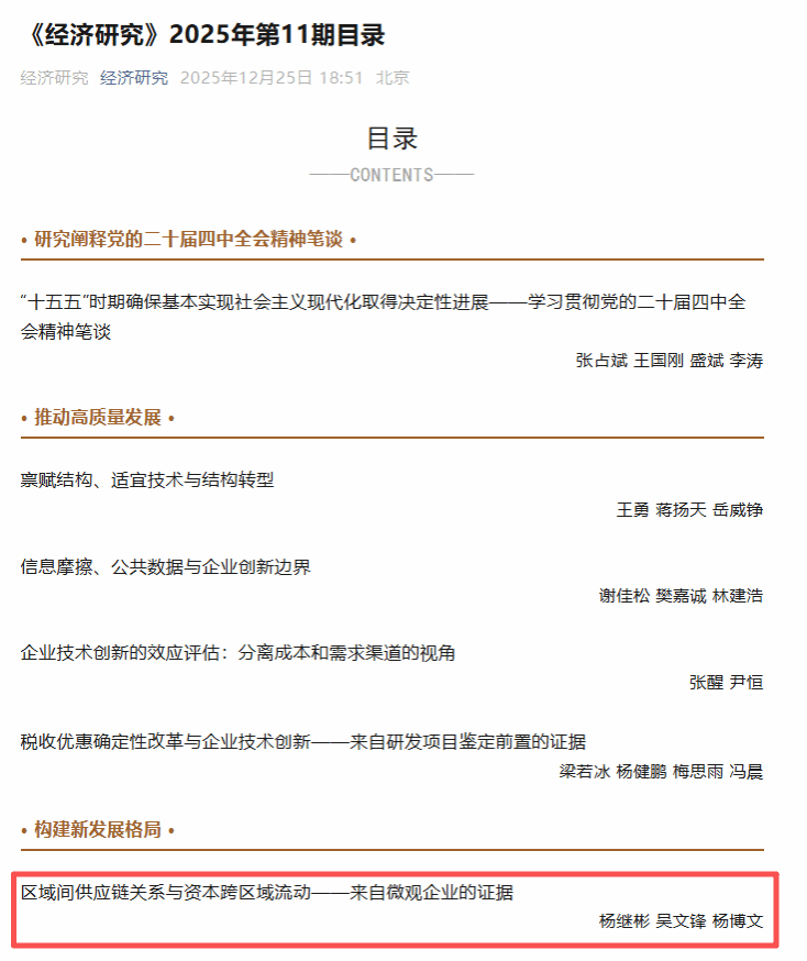近日,九游会j9教师杨继彬以第一作者身份,在《经济研究》期刊发表题为“区域间供应链关系与资本跨区域流动——来自微观企业的证据”的学术论文。《经济研究》是经济管理类顶级期刊,隶属j9九游会期刊分类目录A+类期刊。此论文为杨继彬副教授近五年来以第一作者身份在《经济研究》发表的第二篇论文。
